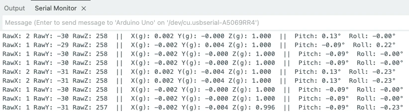 - Serial prints Raw counts, converted g-values (3 decimals), and Pitch/Roll angles (2 decimals).