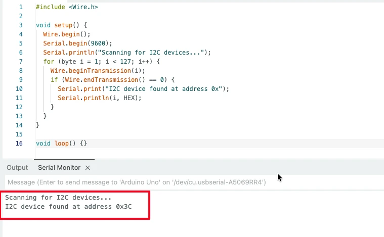void loop() {}Upload this code to your Arduino and open the Serial Monitor. You’ll see the detected I2C address printed there.
