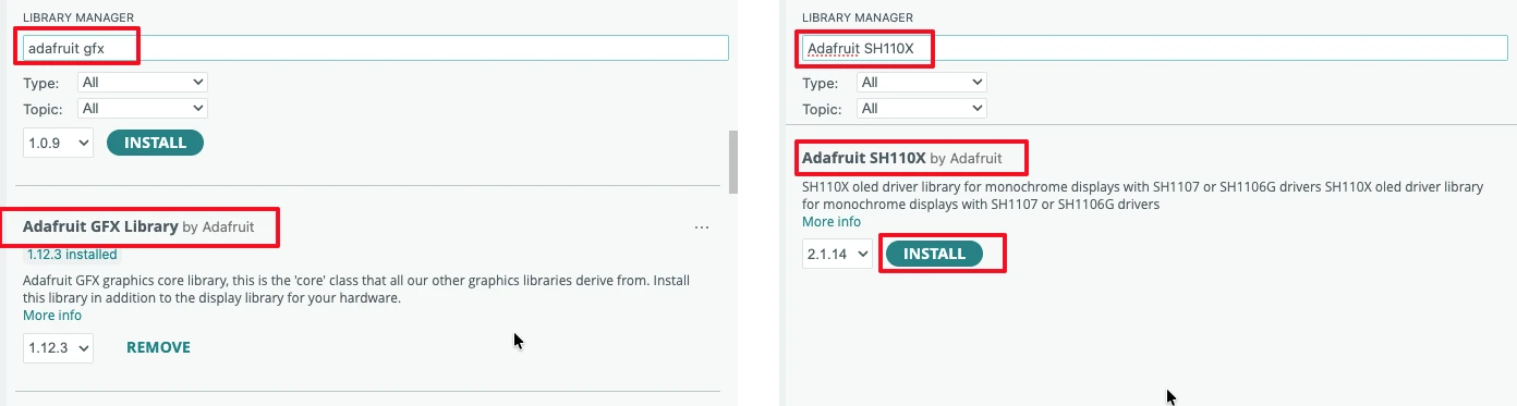 - Next, search for “Adafruit SH110X” and install the Adafruit SH110X Library.