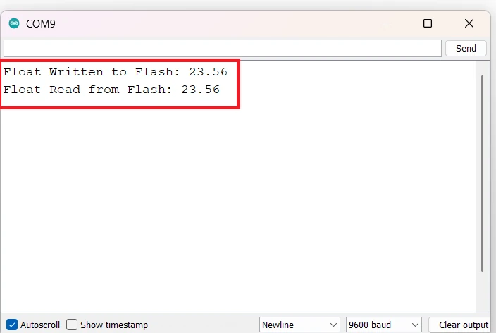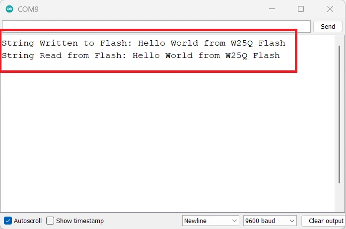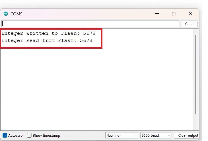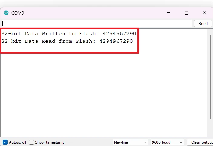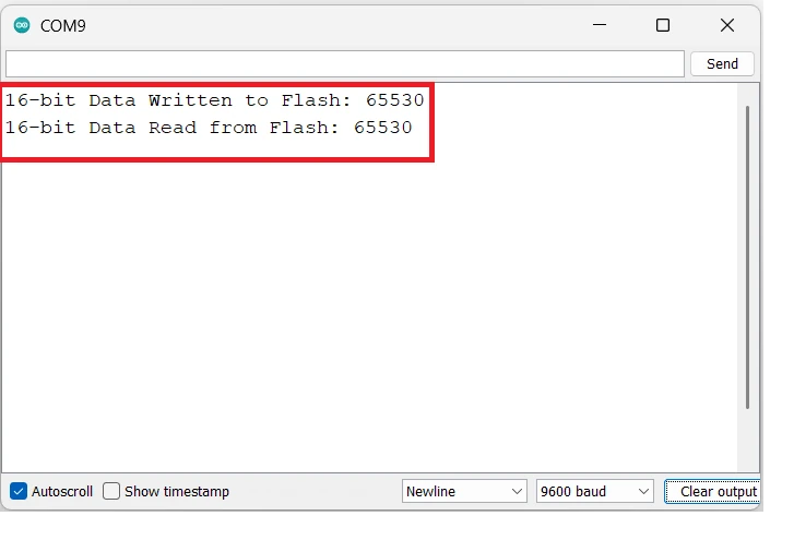 writeStr()writes each character sequentially into flash memory.readStr()retrieves the string and stores it into a character buffer (dataRead).- The