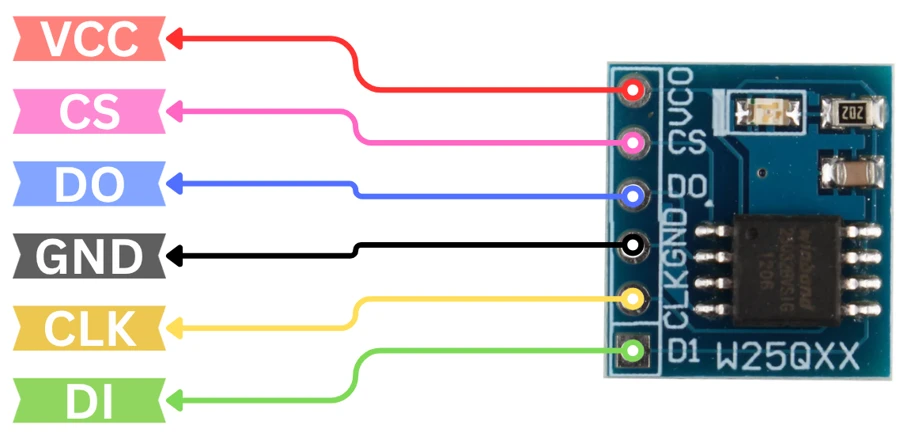 The W25Q Flash memory is a type of serial NOR Flash memory that communicates using the SPI (Serial Peripheral Interface) protocol. It is designed to store large amounts of data, such as program files, sensor logs, or configuration settings, outside the Arduino’s internal memory.