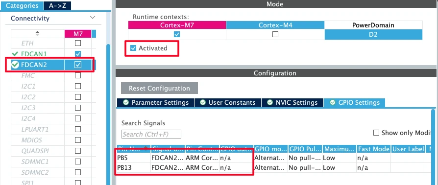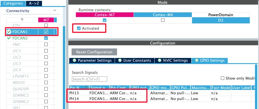 Now enable the FDCAN peripherals for the cortex M7.