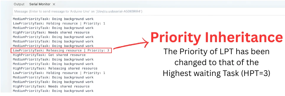 At this point, priority inheritance kicks in. FreeRTOS temporarily raises the priority of the low-priority task to match the high-priority task. This prevents the medium-priority task from preempting it. As a result, the low-priority task finishes faster, releases the mutex, and then returns to its original priority.