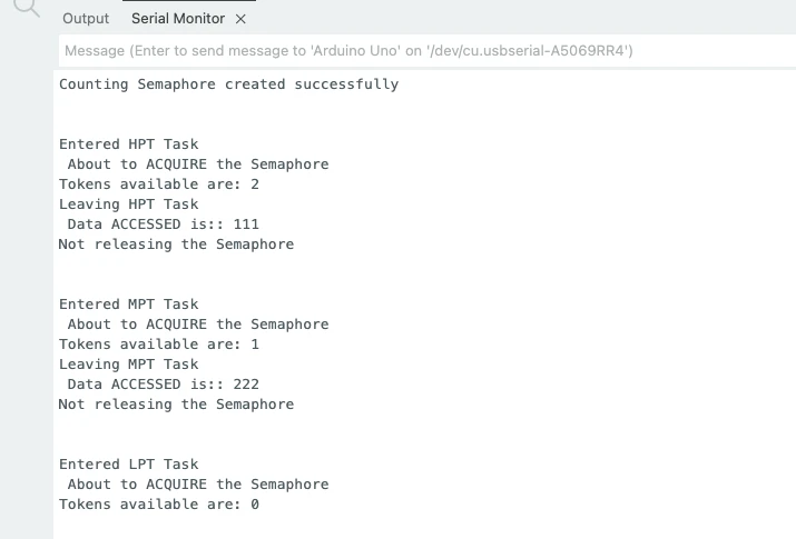 SerialMutex = xSemaphoreCreateMutex();This ensures only one task at a time can use Serial, and FreeRTOS will apply priority inheritance automatically if a high-priority task requests the mutex.