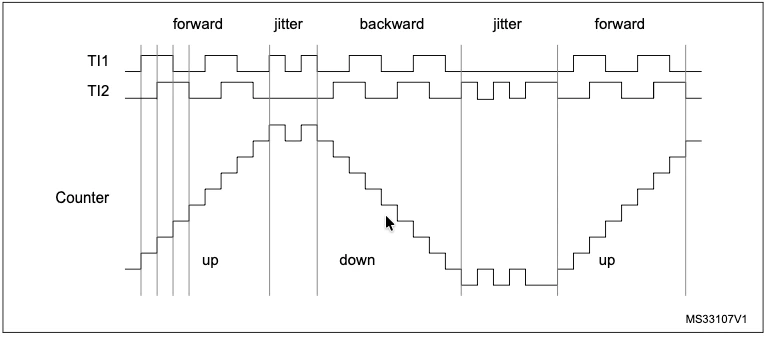 The timing diagram below shows how STM32’s Timer Encoder Mode works in TI12 configuration.