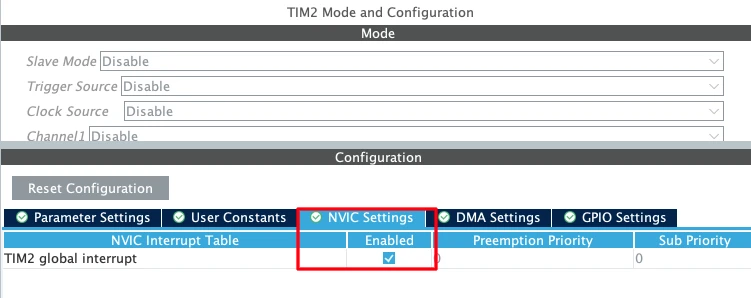 After configuring the parameters, go to the NVIC Tab and enable the interrupt as well.