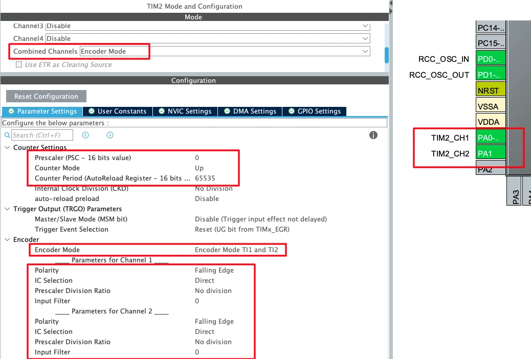 Inside the cubeMX, I am going to configure the Timer 2 in the encoder mode. The image below shows the Timer configuration.