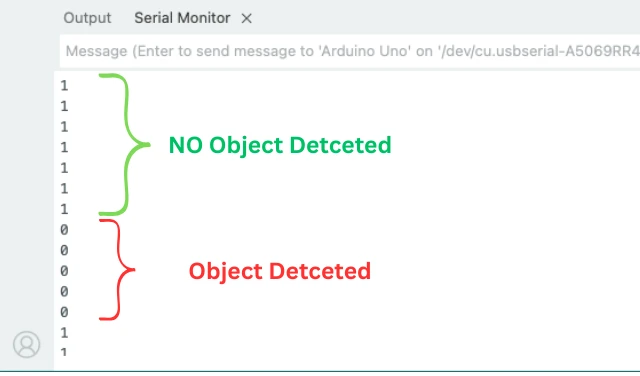 loop(),digitalRead()checks the sensor. - If the output is LOW, it means an object is detected. The LED turns ON, and a message prints to Serial Monitor.