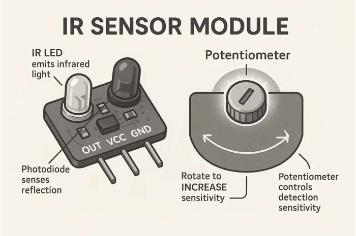 The IR sensor has a potentiometer that allows you to adjust its detection sensitivity. Proper adjustment ensures the sensor can detect objects accurately without false triggers. In this section, we will learn how to fine-tune the sensor and optionally use Arduino to calibrate it.