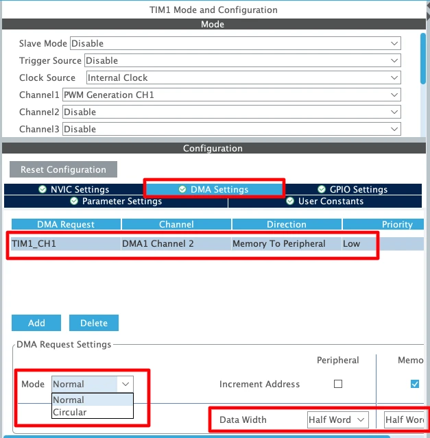 The image below shows the CubeMX Configuration for the STM32 PWM DMA Mode.