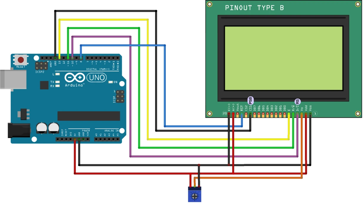 | ST7920 Pin No. | Pin Name | Function in SPI Mode | Arduino Pin | Important Notes |