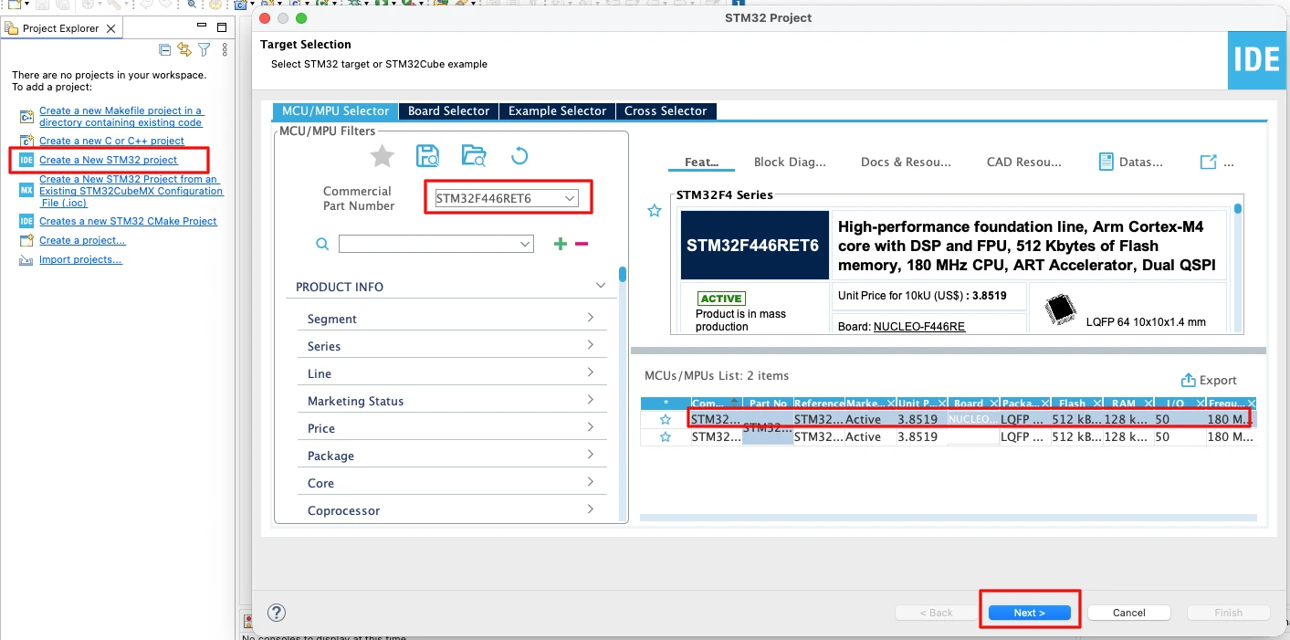 Start CubeMX and create a New Project. Select your board or MCU from the list.