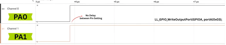 However, when using LL_GPIO_WriteOutputPort, the port is updated in a single write operation. As a result, PA0 and PA1 go high at exactly the same moment.