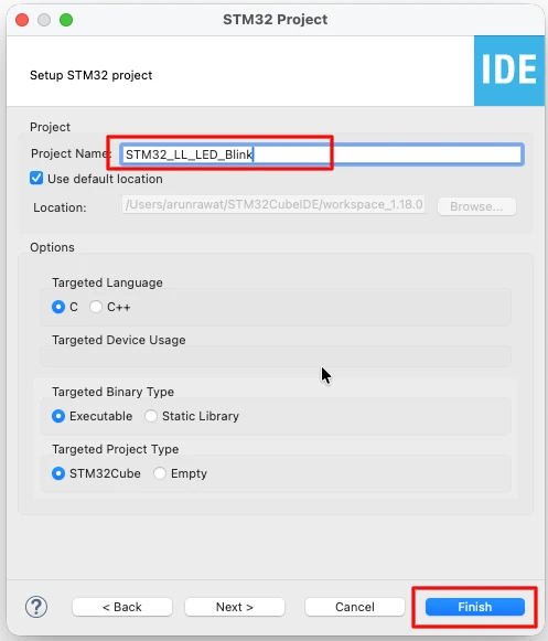 This step is important because CubeMX uses HAL by default. Switching to LL gives you direct control over the GPIO registers.
