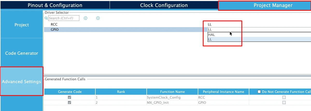 Now open Project Manager → Advanced Settings. Enable LL Drivers for all peripherals. This ensures CubeMX generates clean, lightweight LL code.