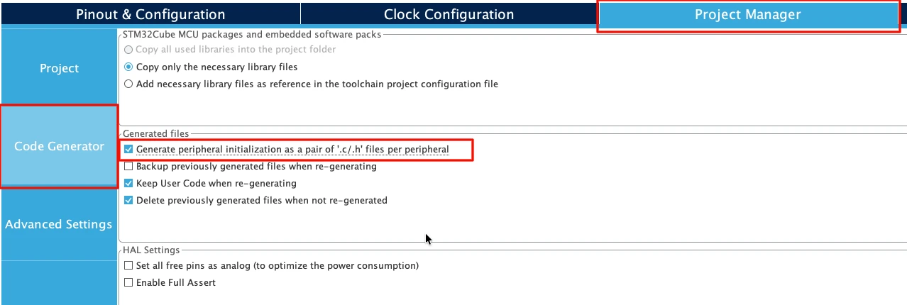Next, go to Code Generator and select “Generate Peripheral Initialization as a pair of .c/.h files per peripheral”. This will generate a separate source files for all the peripherals we will use in a project.