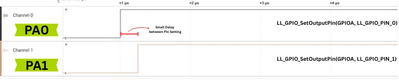 When using LL_GPIO_SetOutputPin for PA0 and PA1, each pin is updated separately. This causes a small, visible delay between PA0 going high and PA1 following it.