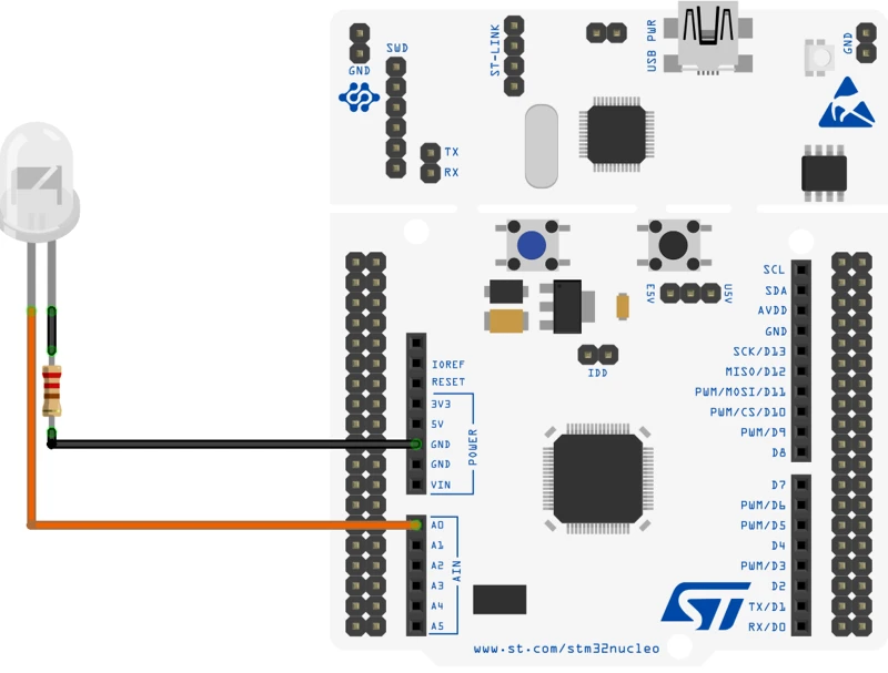 Before testing the input methods, we need a simple hardware setup. I have connected an LED to PA0.