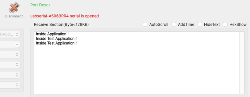 Once flashing is complete, the bootloader jumps to the new application. The image below shows the log printed on the serial console.