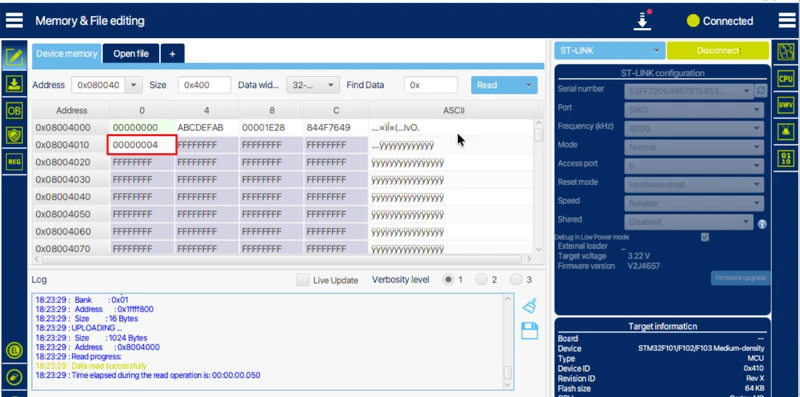 You can also connect the board to STM32CubeProgrammer and check the application header. The version field should now show the new version number, proving that the OTA update worked.