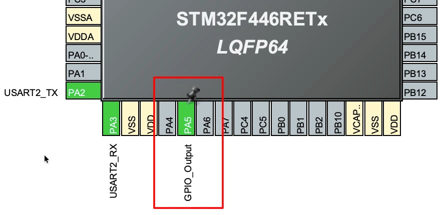 We will configure the Pin PA5 as the GPIO Output. The LED will be later controlled by receiving the command from the computer using UART.