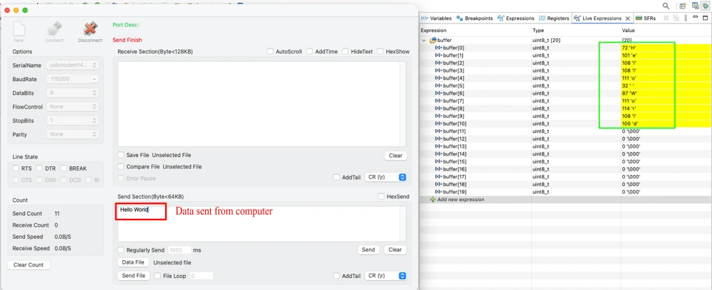 The image below shows the data sent by the computer via serial terminal. The same data is received by the STM32, and it is stored in the buffer.