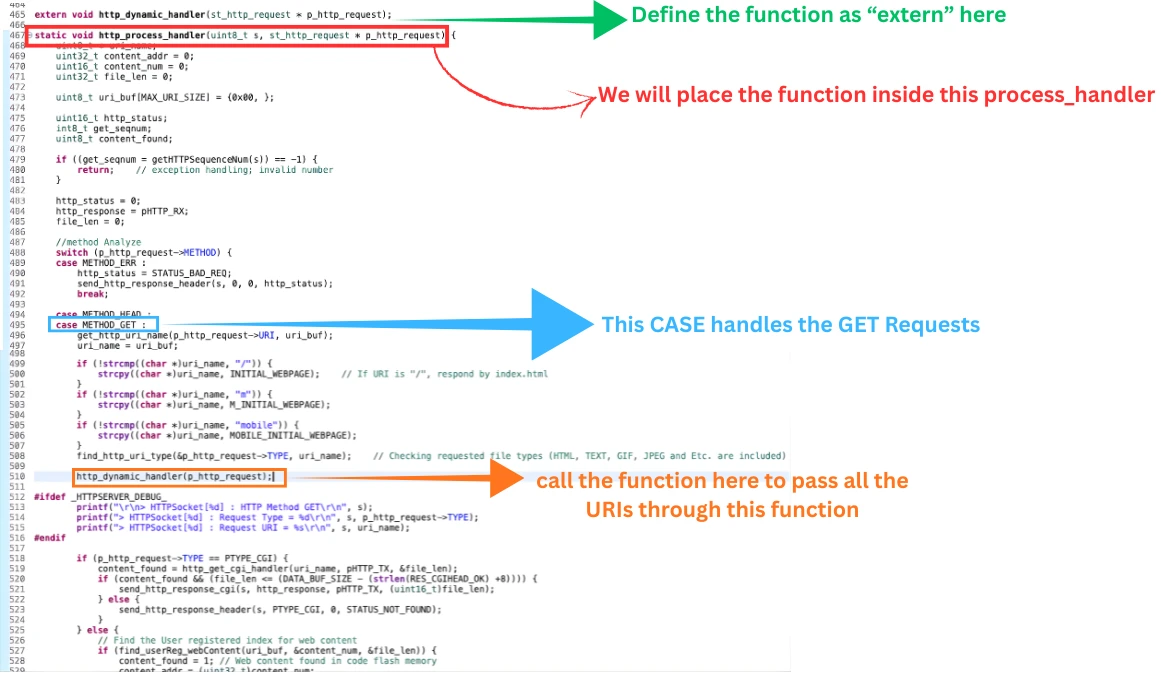 To control hardware from a web request, we create a custom function named http_dynamic_handler. This function receives the HTTP request structure, which includes the URI.