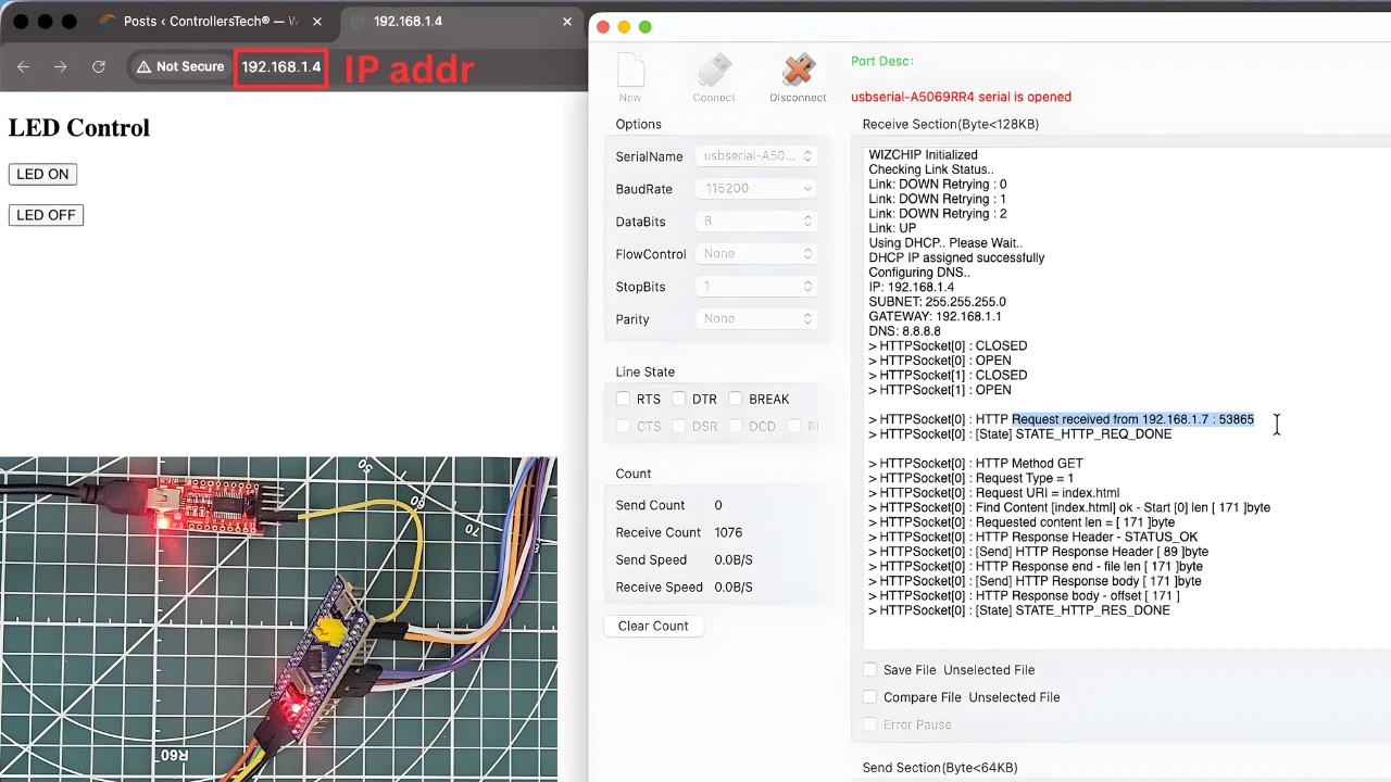httpServer_setup();This prepares all buffers, registers the web pages, and enables the server sockets. At this point, the STM32 is ready to accept HTTP requests.