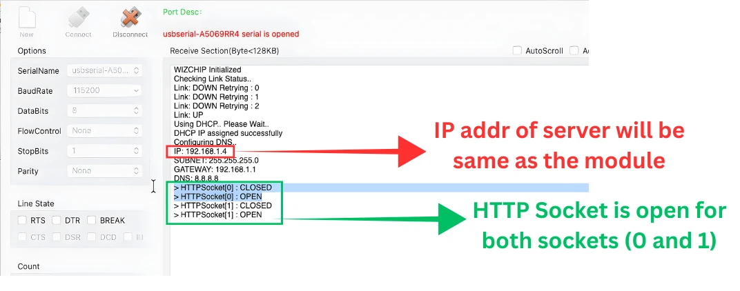 As you can see, after obtaining the IP address using DHCP, the HTTP server is UP on both the sockets. The IP address for this server will be the same as the IP of the module, i.e. 192.168.1.4