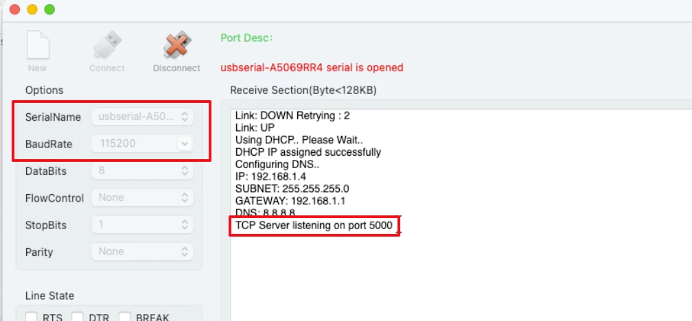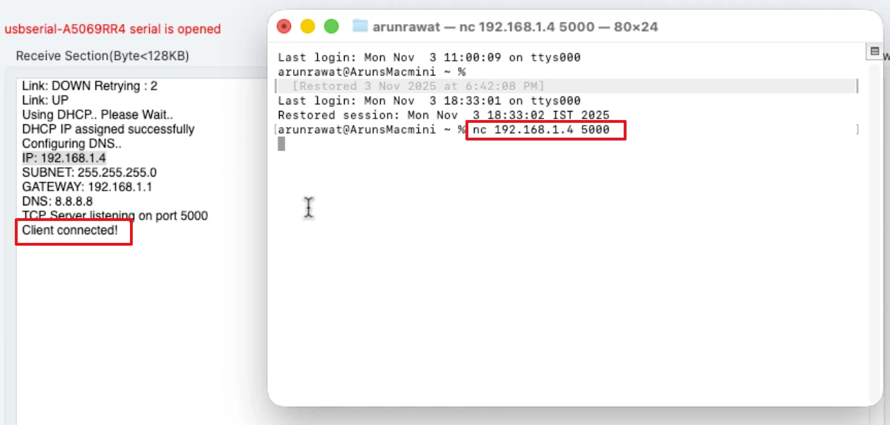 - Open your TCP client tool and Connect to the STM32’s IP address and port 5000.