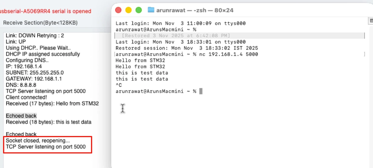 This confirms that the TCP echo server is working perfectly. The data sent by the client is received by the STM32 and sent back exactly as it is.