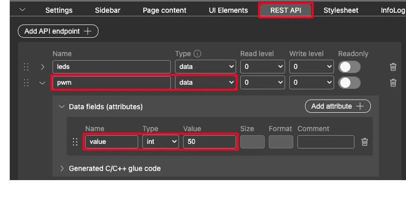 Back in the REST API tab, I created another endpoint and named it pwm. The type is again set to data.