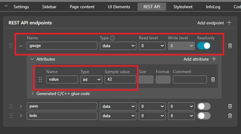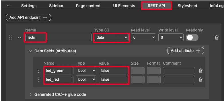 I created an endpoint and named it leds. The type is set to data. A data type endpoint maps directly to a C structure in the generated code. Think of it as a struct that holds the current state of the UI element.