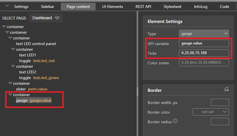 Now go to the Page Content section and click on the gauge element. Set its API variable to gauge.value.