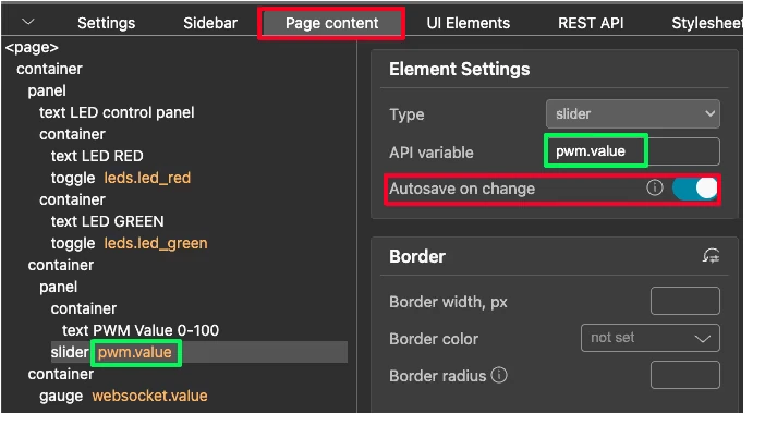 Click on the slider element on the Page Content section. In the settings panel, set the API variable to pwm.value. Also enable Autosave on change here too.
