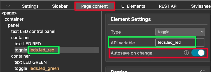 Now go back to the Page Content section and click on the first toggle button. In the element settings panel, set the API variable to leds.led_red. Do the same for the second toggle button and set its API variable to leds.led_green.