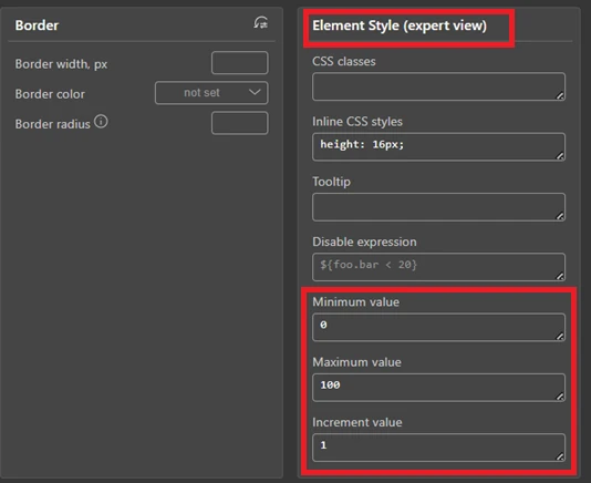 We can also control the range of the slider. In the Element Style (expert view) panel, there are fields for Minimum value, Maximum value, and Increment value.