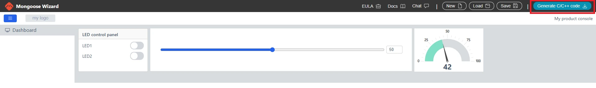 The first step is to create the web dashboard that will run in the browser. Mongoose provides an online tool called the Mongoose Wizard for this. It lets us design the UI visually and then generates all the frontend code (HTML, CSS, and JavaScript) embedded directly inside the C project. We do not have to write any web code manually.