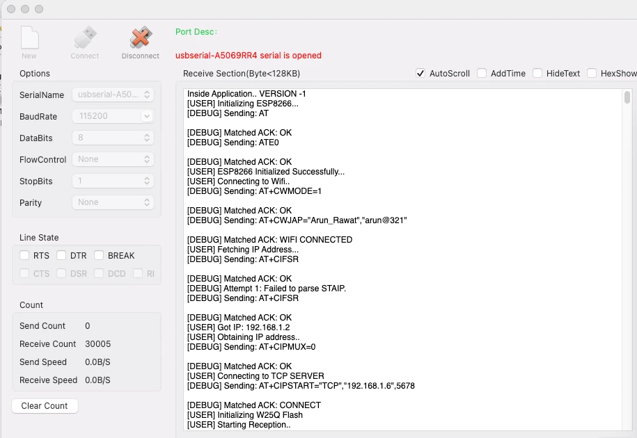 The ESP8266 sends back status messages, which the application monitors. Once the module successfully connects to WiFi and obtains an IP address, it’s ready to communicate over the network.