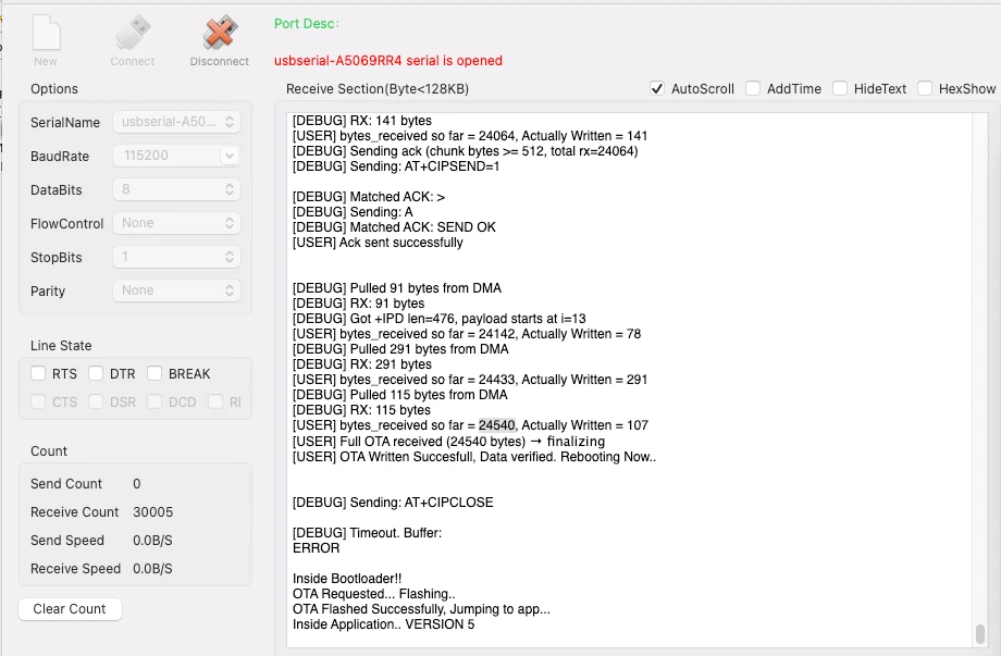 In this section, we will verify the complete OTA update flow over WiFi. At this stage, both the application and the bootloader are ready, and the TCP OTA server is running. Now we will observe how the system behaves before the update, during the OTA process, and after the new firmware is flashed.