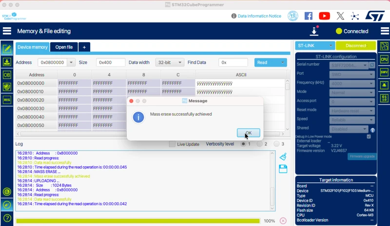 After the OTA update is complete and the system boots into the new firmware, we should always verify that the correct application has been flashed. The easiest and safest way to do this is by using STM32CubeProgrammer.