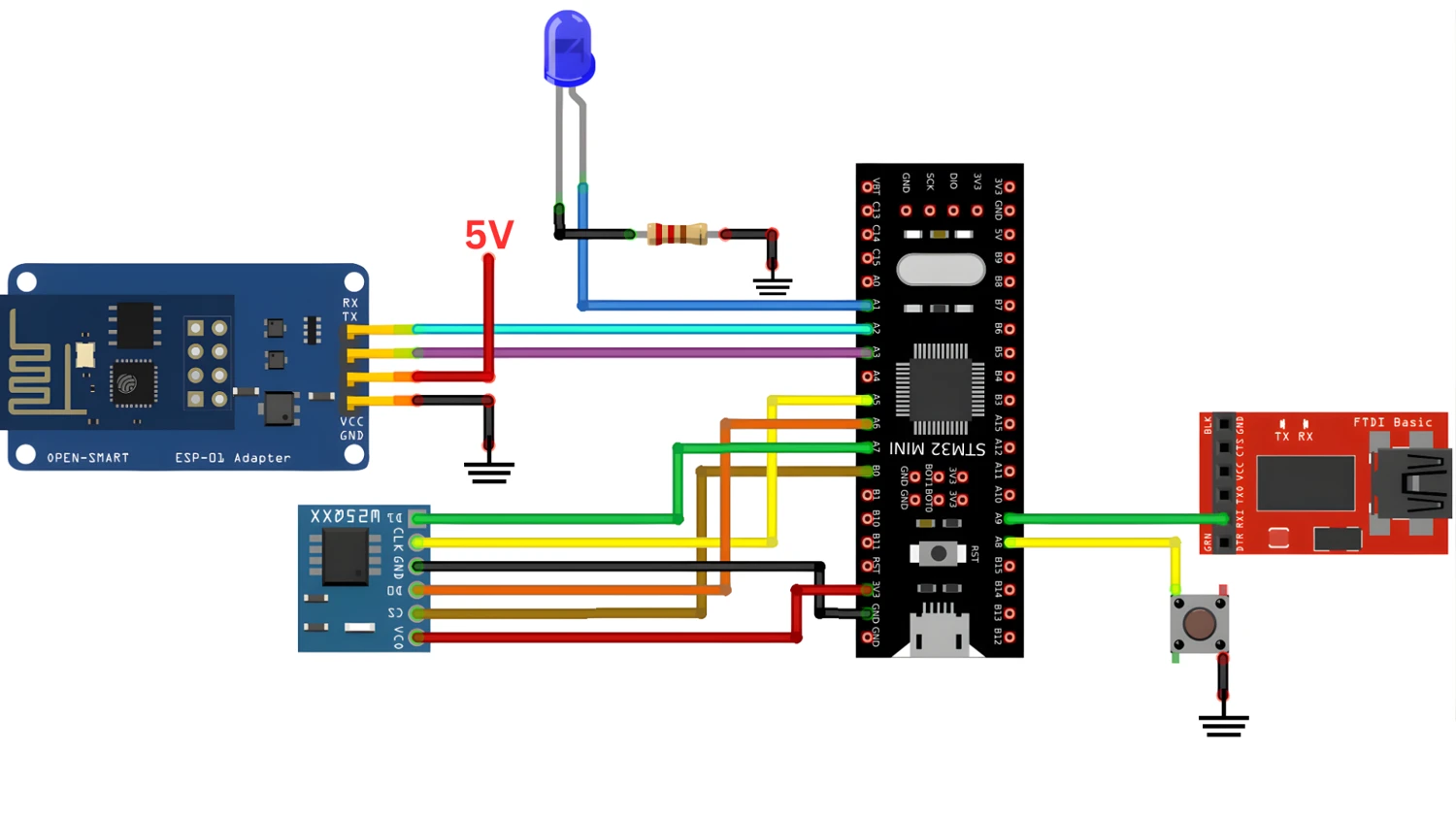Now that we understand the system architecture, let’s connect all the hardware components. This section shows you exactly how to wire the ESP8266, external flash memory, and other peripherals to the STM32F103C8 board.