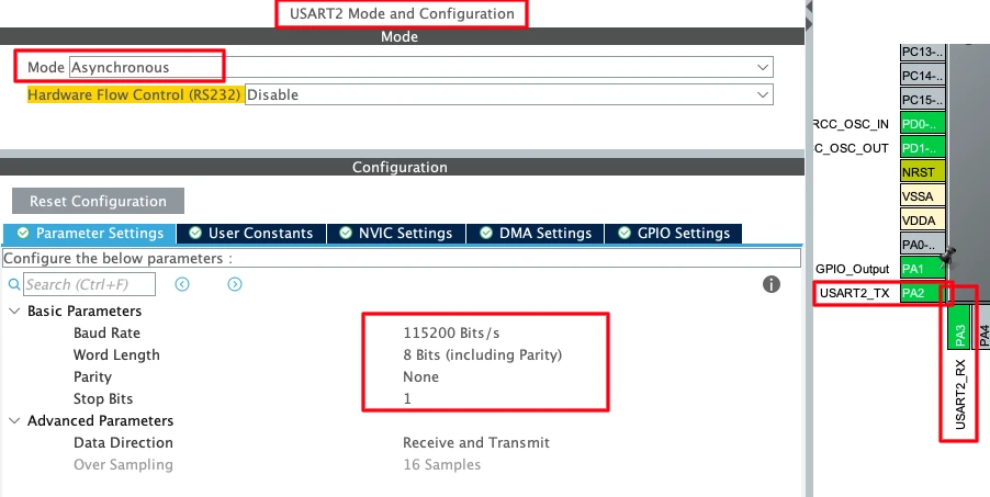 | RX | PA2 (UART2 TX) |