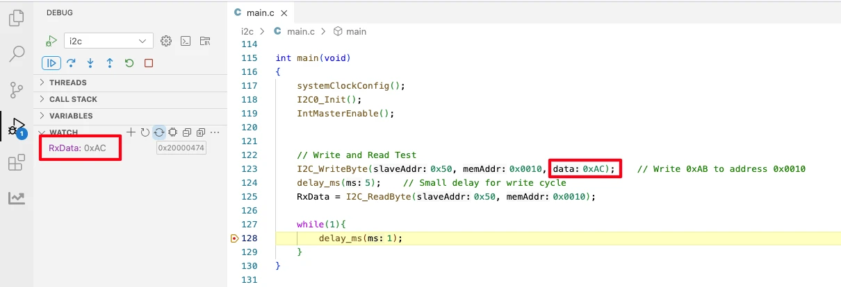 After running the code, you can see the value of the RxData variable is 0xAC. This is the value read from the EEPROM memory address 0x0010. We stored the same value at this address and now it is read back from it.