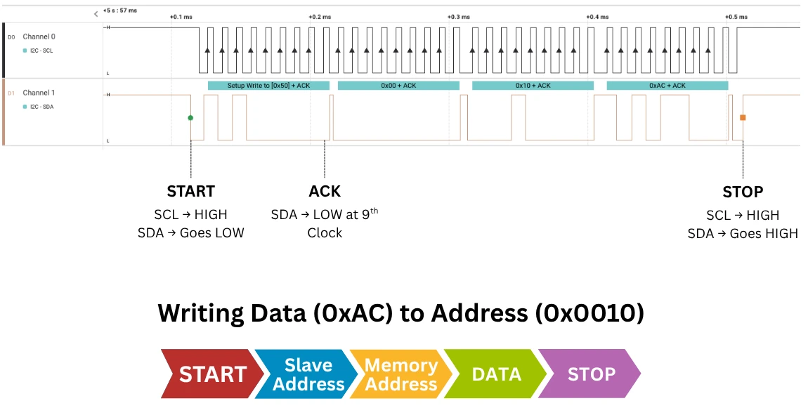 The image below shows the output of logic analyzer when the Data byte (0xAC) is written to address 0x0010. It shows the Start Condition, ACK, Data written to the slave and Stop Condition.