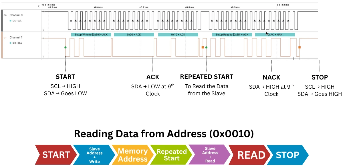 Similarly, the image below shows the output of when the Data byte is Read from address 0x0010. It shows the Start Condition, ACK, Repeated Start, Data Read from slave, Nack and the Stop Condition.