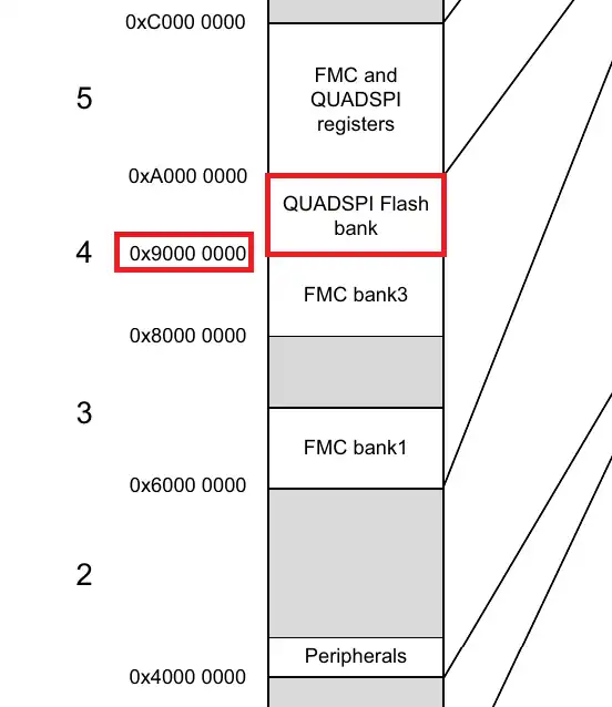 You can see the QUADSPI Flash bank is located at the address 0x90000000. Basically this space is reserved for the QuadSPI memory, and if we are using one, this is where we can access it.
